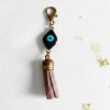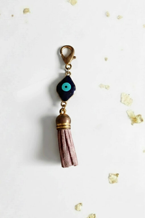 Carry powerful protection and subtle elegance with this unique gold-toned charm clip. The design features a prominent, diamond-shaped Evil Eye medallion rendered in smooth, contrasting enamel, with a deep navy blue background and a bright teal iris. Dangling beneath the eye is a soft, matching faux leather tassel in a delicate dusty rose or beige tone, which adds sophisticated movement and flair. The durable gold-toned lobster clasp allows for easy, secure attachment to your handbag zipper, keys, planner, or backpack. This decorative accessory makes an ideal and thoughtful gift, blending bold, geometric design with meaningful, protective symbolism for everyday security.