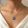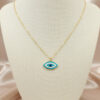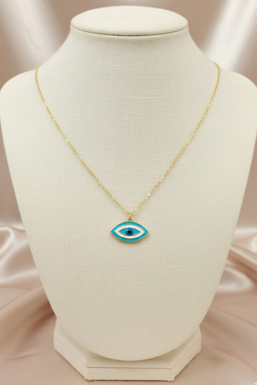 Adorn your neckline with this chic and eye-catching gold necklace. The centerpiece is a classic Evil Eye charm rendered in a smooth, vibrant teal enamel, offering a fresh, modern twist on the traditional color. The eye itself features a brilliant blue iris, creating a striking focal point. As a globally recognized symbol, the Evil Eye is believed to offer powerful protection and good fortune to the wearer. Its elegant shape and beautiful color palette make it an ideal accessory for everyday wear, effortlessly adding a touch of sophisticated style and meaningful symbolism to any ensemble.