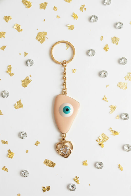 Chic Gold Evil Eye Keychain with Peach Enamel & Crystal Heart Charm