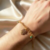 Adorn your wrist with this chic and protective gold charm bracelet. The piece features a trendy, chunky oval link chain that offers a contemporary, substantial look. The combination of the bold chain and the meaningful charms creates an accessory that is both highly fashionable and deeply symbolic. The bracelet is adjustable for a comfortable and secure fit, making it a perfect everyday statement piece that effortlessly blends meaningful tradition with modern style.