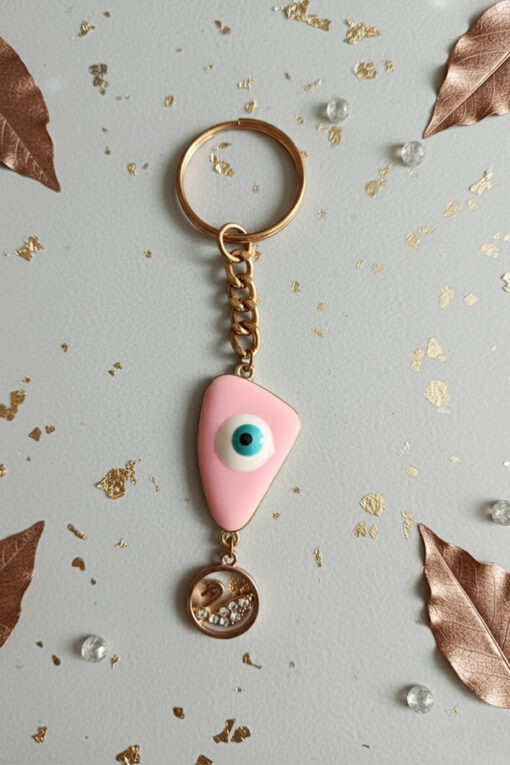 Chic Gold & Pink Evil Eye Keychain with Floating Crystal Charm