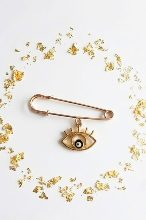 The design features a polished, high-quality safety pin from which hangs a single, artistic Evil Eye charm. The charm is crafted in a sophisticated gold outline style, featuring delicate lashes that frame a central eye bead. This minimalist approach gives the traditional talisman a contemporary, airy feel while retaining its powerful symbolism. Known globally as a shield against negative energy and jealousy, the Evil Eye brings peace and good fortune to the wearer. This versatile pin is perfect for customizing a denim jacket, securing a scarf, decorating a handbag, or even attaching to a stroller for a baby’s protection. It is an ideal gift for those who appreciate subtle luxury and meaningful accessories that blend fashion with function.