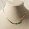 The piece features a smooth, polished gold Herringbone or Snake Chain that sits elegantly on the neckline for a sleek, high-end look. Adorning the center are a dazzling row of small Evil Eye charms, each crafted with a vibrant enamel finish in various colors, including classic blue, emerald green, and bold red. This playful yet powerful collection of charms symbolizes protection and good fortune against negative energy. Its unique combination of the sophisticated chain texture and the colorful, meaningful charms makes it a versatile accessory. Perfect for adding a personalized pop of color and style to any outfit, this necklace is an essential piece for those who appreciate fashionable, symbolic jewelry.