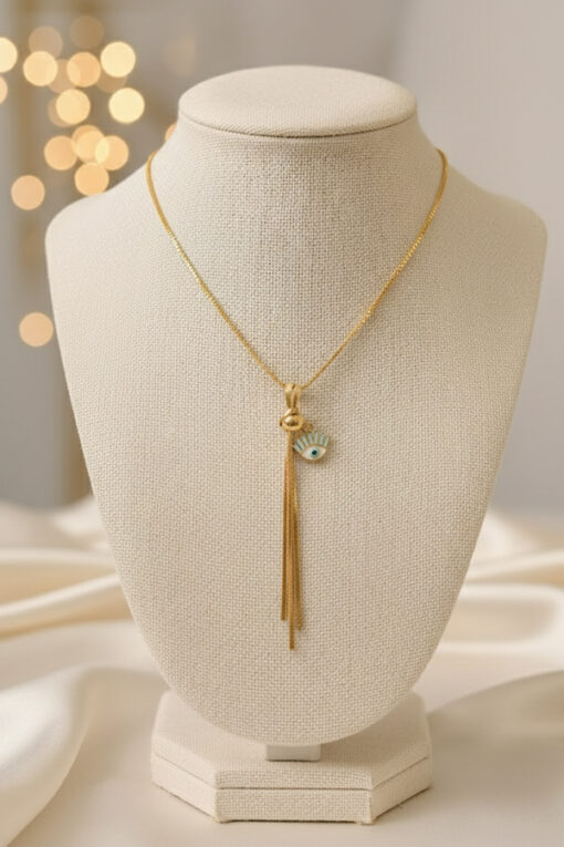 Attached subtly at the top of the tassel is a small, charming Evil Eye motif, rendered in soft white and blue enamel.