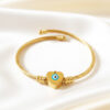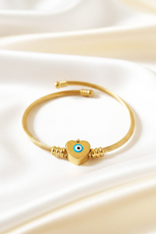 Wrap your wrist in a blend of modern sophistication and timeless protection with this exquisite gold cuff bangle. The bracelet features a stylish twisted cable wire design, offering a luxurious, high-end texture that is both durable and flexible. The centerpiece of this stunning accessory is a gold heart charm, flanked by textured rings. Nestled within the heart is a vibrant blue and white Evil Eye motif, creating a beautiful fusion of romance and spiritual security. The heart symbolizes love and affection, while the Evil Eye is a powerful talisman known to ward off negative energy and attract good fortune. This bangle is the ultimate stackable accessory. Its industrial-chic cable design pairs perfectly with watches or smooth bangles, yet it is distinct enough to shine on its own. Whether you are treating yourself or searching for a meaningful gift for a loved one, this bracelet offers a stylish way to carry love and protection wherever you go.