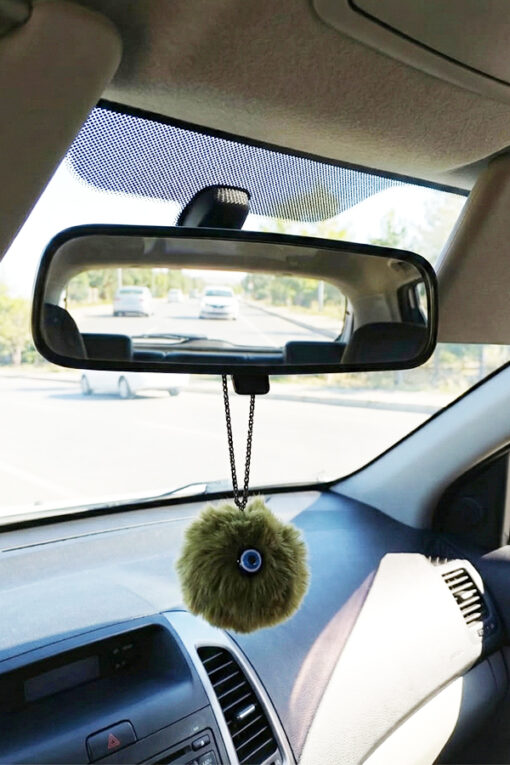 Infuse your surroundings with a touch of earthy elegance and powerful protection using this unique Evil Eye charm. The centerpiece is a classic glass Evil Eye medallion (Nazar), boldly framed by a plush, soft olive green faux fur pom-pom. The Evil Eye is a globally revered talisman believed to ward off negative energy and attract good fortune. This accessory beautifully contrasts the sleek, protective glass eye with the warm, tactile texture of the fur. Suspended by a sturdy black beaded loop, it is perfect for hanging on a car rearview mirror, handbag, or as a quirky home accent. This delightful piece makes a thoughtful and stylish gift for anyone who appreciates bohemian charm and meaningful symbolism.