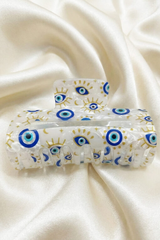 Elevate your hairstyle while guarding your energy with this stunning Evil Eye Hair Claw Clip. Crafted from high-quality cellulose acetate, this clip features a lustrous, pearlescent white base that shimmers subtly in the light, giving it a luxurious, marble-like finish. This trendy combination of gold and blue against the creamy white background creates a sophisticated, boutique aesthetic. Beyond its beauty, the Evil Eye is a globally recognized talisman believed to ward off negativity and attract good fortune.Designed with strong interlocking teeth and a durable spring, this clip provides a secure and comfortable hold for various hair textures and volumes. Whether you are styling a chic French twist, a messy bun, or a casual half-up look, this accessory adds an instant pop of personality. It is the perfect blend of bohemian style and spiritual symbolism, making it a delightful gift for trendsetters or a self-care treat for your own collection.