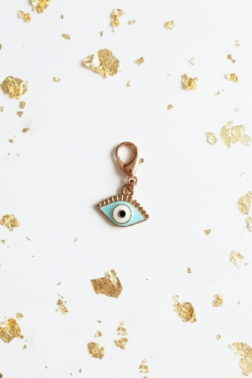 Add powerful protection and vibrant style to your accessories with this unique Evil Eye charm clip. The eye is rendered in a smooth, serene light blue/teal enamel and accented by delicate, stylized gold lash details, giving it a distinctive, artistic flair. The Evil Eye is a globally recognized talisman believed to bring good luck and safeguard against negative energy. The charm features a secure, easy-to-use lobster clasp, allowing you to effortlessly clip it onto necklaces, bracelets, zippers, keychains, or bags. This versatile and durable accessory makes an ideal and thoughtful gift, perfectly blending meaningful, powerful symbolism with a fashionable, chic aesthetic.