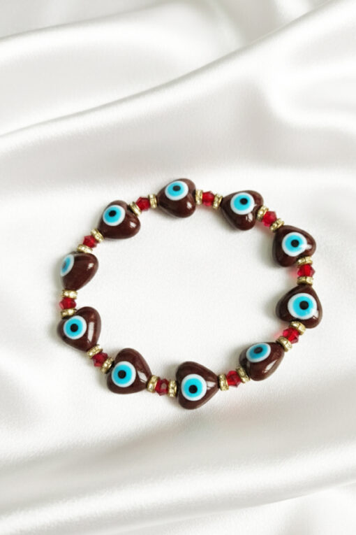 Tags: bold color jewelry, brown bead bracelet, brown red bracelet, chocolate brown evil eye bracelet, designer style bracelet, elegant charm bracelet, everyday wear bracelet, evil eye fashion accessory, evil eye protection jewelry, good luck charm bracelet, heart charm bracelet, heart evil eye bracelet, modern evil eye bracelet, protective charm jewelry, red crystal bracelet, romantic evil eye jewelry, spiritual protection jewelry, statement bracelet, stylish wrist accessory, women’s fashion jewelry