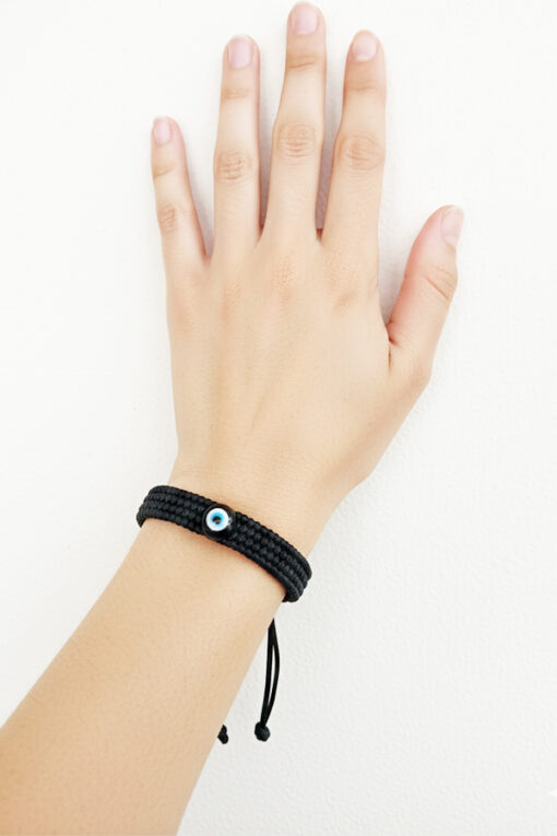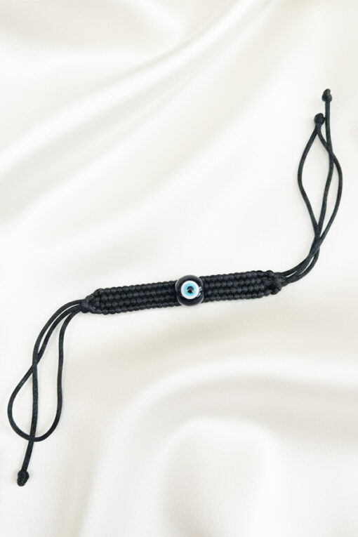 Often referred to as a “Nazariya,” this accessory is a timeless talisman believed to shield the wearer from the “evil eye” and ward off negative energies. The centerpiece is a traditional round blue Evil Eye bead made of glass, featuring concentric circles of blue, white, and black. It is securely woven into a durable black macramé cord, crafted with a sturdy square knot pattern that adds texture and resilience to the design. In many traditions, the black thread itself is considered grounding and absorbent of negativity, doubling the protective intent of the piece. Designed for everyday wear, the bracelet is lightweight, waterproof, and features a convenient adjustable sliding knot. This allows you to easily loosen or tighten the band for a perfect, custom fit on any wrist size. Its minimalist, unisex design makes it suitable for men, women, and children alike. Wear it alone for a subtle statement or stack it with your watch and other bracelets for a layered look.