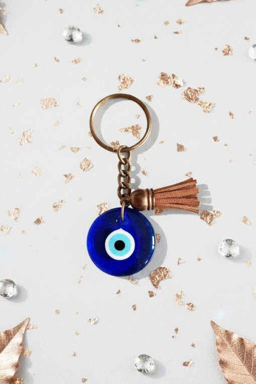 Carry powerful protection and rustic charm with this classic Evil Eye keychain. The design centers around a substantial, polished deep blue glass Evil Eye medallion, offering a vibrant and authentic presence. This iconic blue glass charm is a globally recognized talisman of protection, believed to bring good luck and safeguard against negative energy. The charm is beautifully complemented by a small, textured faux leather tassel in a natural brown tone, adding a touch of rustic elegance and movement. The durable antique gold-toned keyring and chain ensure you can easily attach this beautiful piece to your keys, handbag, backpack, or car mirror.