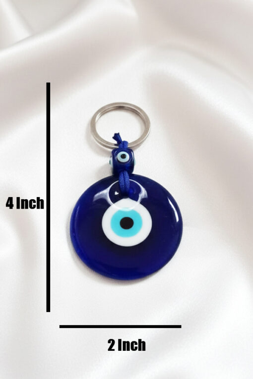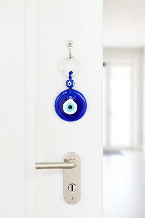 The piece features a large, polished deep blue glass charm, universally recognized and revered for its power to ward off negative energy and bring good fortune. The charm is secured by a sturdy metal keyring and accented with a small, matching Evil Eye bead tied with a subtle blue cord, enhancing its authentic look. This meaningful piece is wonderfully versatile—it can be used as a traditional keychain, hung on a handbag, backpack, or even placed near an entrance or car mirror for continuous protection. This durable and striking accessory makes an ideal, thoughtful gift for housewarmings, new jobs, or anyone seeking to infuse their daily life with safety and positive energy.