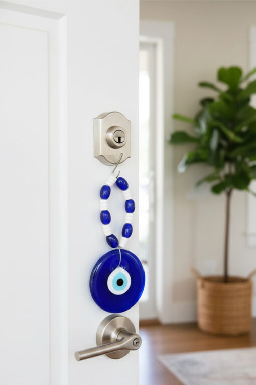 Bring classic protection and powerful positive energy into your home or office with this traditional Evil Eye (Nazar) hanging. The centerpiece is a prominent, polished deep blue glass medallion, featuring the iconic concentric circles of blue and white, which form the globally recognized protective talisman. The hanging features a beautiful beaded loop crafted from alternating deep blue oval glass beads and white cylindrical beads, adding a unique, handcrafted texture. The Evil Eye is a powerful amulet used to ward off negative energy and bring good fortune. This meaningful piece serves as both a stylish decorative accent and a potent talisman. It is perfect for hanging near an entrance, in a window, or on a wall, making it an ideal gift for housewarmings or anyone seeking to infuse their space with luck and security.
