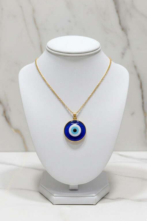 Adorn your neckline with this timeless and elegant gold pendant necklace. The pendant showcases the iconic Evil Eye motif with a striking design: the iris is set in a vibrant blue and white enamel that is beautifully contrasted by a deep, protective navy blue outer ring. This ancient symbol is renowned globally for bringing good luck and safeguarding the wearer from negative energy. Its classic, bold appearance makes it a versatile accessory. Perfect for wearing every day or layering with other chains, this necklace is an essential piece that effortlessly blends meaningful tradition with sophisticated, modern style.