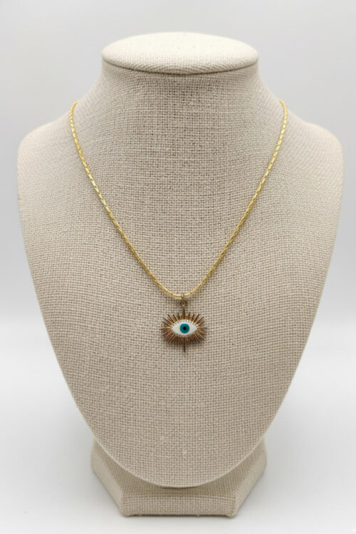 Adorn your neckline with this timeless and elegant gold pendant necklace. The pendant showcases the iconic Evil Eye motif with a striking design: the iris is set in a vibrant blue and white enamel that is beautifully contrasted by a deep, protective navy blue outer ring. This ancient symbol is renowned globally for bringing good luck and safeguarding the wearer from negative energy. Its classic, bold appearance makes it a versatile accessory. Perfect for wearing every day or layering with other chains, this necklace is an essential piece that effortlessly blends meaningful tradition with sophisticated, modern style.