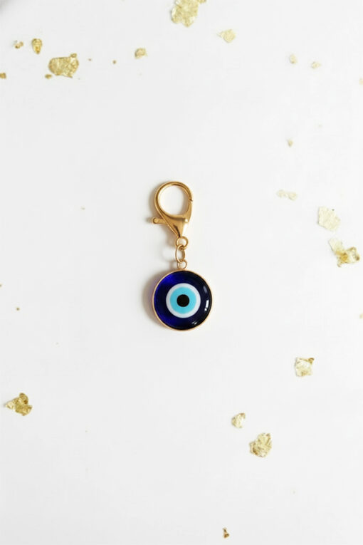 The design centers around a vibrant, circular deep blue glass Evil Eye medallion, beautifully framed by a polished gold tone. The eye itself features the traditional blue, white, and black iris, offering a strong and commanding presence. This iconic symbol is a globally recognized talisman of protection, believed to bring good luck and safeguard against negative energy. The durable gold-toned lobster clasp allows for easy and secure attachment to anything from your keyring and handbag to backpack zipper pulls. This high-quality, decorative charm is an ideal and thoughtful gift that blends ancient, powerful symbolism with a sophisticated, essential style for everyday use.