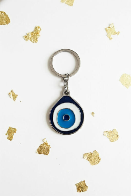 The design features a bold, circular-to-teardrop-shaped medallion, beautifully framed in a polished silver tone. The eye itself is rendered in a vivid, layered enamel design using deep navy blue, bright cobalt blue, and crisp white, creating a striking focal point. This iconic symbol is a globally recognized talisman of protection, believed to bring good luck and safeguard against negative energy, making it both a beautiful accessory and a meaningful charm. The durable silver-toned keyring ensures you can easily attach this chic piece to your keys, handbag, backpack, or car mirror. This high-quality, decorative keychain is an ideal and thoughtful gift that blends ancient, powerful symbolism with a sophisticated, essential style for everyday use.