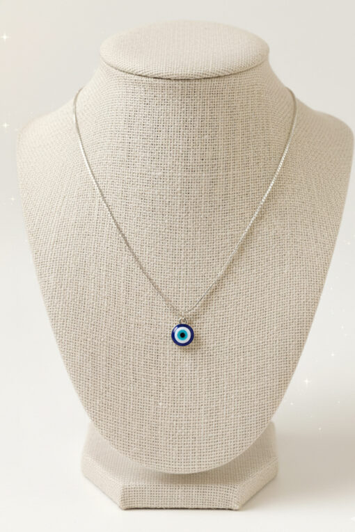 The piece features a fine, elegant box chain that beautifully highlights the petite circular pendant. The charm is a classic Evil Eye motif, rendered in smooth enamel with vibrant blue and white colors. This ancient symbol is renowned globally for bringing good luck and safeguarding the wearer from negative energy. Its simple, elegant design makes it the perfect accessory for subtle, everyday wear. The neutral silver tone and iconic motif ensure it pairs effortlessly with any outfit. This durable, lightweight piece is an essential addition to any jewelry collection and makes a heartfelt, meaningful gift.