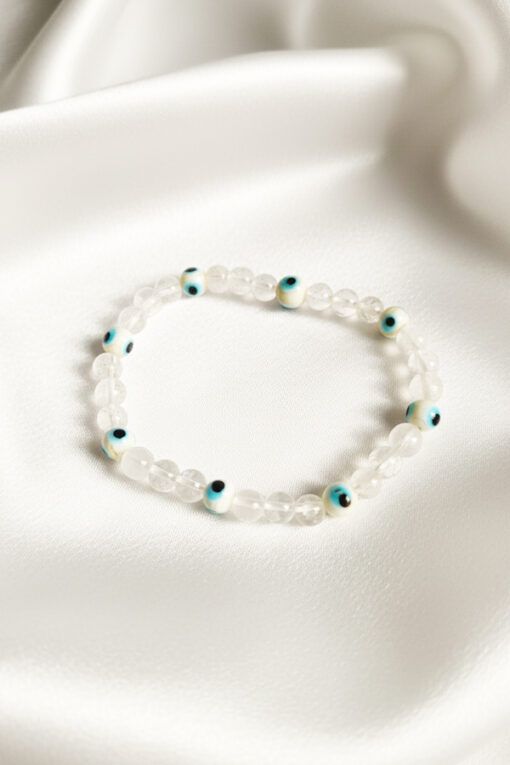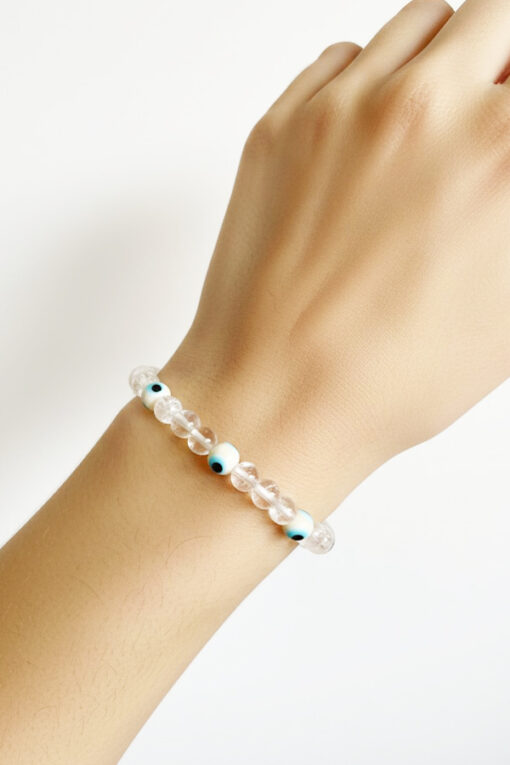 Tags: calming crystal bracelet, cleansing crystal bracelet, clear quartz evil eye bracelet, designer style bracelet, energy healing jewelry, everyday wear bracelet, evil eye protection bracelet, fashion evil eye accessory, good luck charm bracelet, healing crystal bracelet, minimalist crystal bracelet, modern evil eye jewelry, protective amulet bracelet, quartz bead bracelet, spiritual protection jewelry, stylish protection bracelet, symbolic protection bracelet, transparent bead bracelet, trendy wrist accessory, unisex beaded bracelet