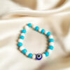 This vibrant accessory features a cheerful, alternating pattern of crisp white and bright turquoise-blue beads, evoking the calming visuals of white sandy beaches and clear summer waters. The design is rhythmic and balanced, creating a fresh and clean aesthetic that pops beautifully against the skin. The white beads symbolize purity and new beginnings, while the bright blue hue represents healing, calm, and open horizons. At the center sits a single, contrasting dark blue Evil Eye charm, a watchful guardian believed to deflect negative energy, jealousy, and bad luck. This bracelet is the ultimate accessory for those who love a “fresh” look. It pairs perfectly with casual summer outfits, beachwear, or denim. Whether you are looking for a daily talisman to bring you mental clarity or a stylish gift that conveys wishes of safety and peace, this piece offers a perfect blend of modern style and ancient spiritual meaning.