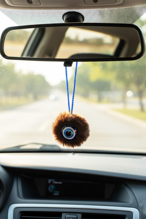 Bring playful charm and powerful protection to your car or space with this unique Evil Eye hanging. The centerpiece is a classic deep blue glass Evil Eye medallion (Nazar), which is framed by soft, plush dark brown faux fur, giving it a warm, cozy, and distinctive look. This piece beautifully blends traditional symbolism with a fashionable, tactile design. It is suspended by a sturdy blue cord, allowing for easy display in your car rearview mirror, home entryway, or anywhere you need a touch of luck and softness. This delightful and meaningful accessory makes an ideal gift for anyone who appreciates unique, charming, and protective decor.