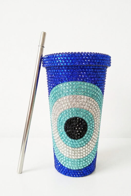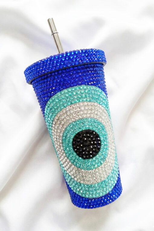 Stay hydrated in the most glamorous way possible with this spectacular rhinestone tumbler. This exquisite cup is fully encrusted with thousands of high-quality, shimmering crystals that catch the light from every angle, creating a dazzling effect. The design features a bold, oversized Evil Eye motif, meticulously crafted using a stunning palette of deep royal blue, turquoise, silver, and jet-black stones. More than just a drinkware accessory, this tumbler serves as a portable talisman, believed to ward off negative energy and bring good vibes to your day. It comes complete with a reusable stainless steel straw and a secure lid, making it eco-friendly and perfect for iced coffee, water, or smoothies on the go. It is the ultimate gift for the trendsetter who loves a mix of luxury, sparkle, and spiritual protection.