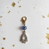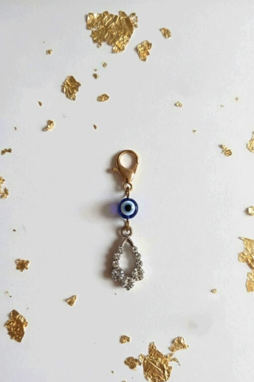 The piece features a classic blue and white Evil Eye bead, a globally recognized talisman believed to bring good luck and safeguard against negative energy. Suspended beneath the Evil Eye is a brilliant teardrop-shaped cluster of micro-pave crystals, adding a touch of sophisticated glamour and light. The silver-toned lobster clasp makes this charm incredibly versatile; easily attach it to your purse zipper, backpack, wallet, keyring, or jewelry chain. This durable and fashionable accessory makes an ideal, thoughtful gift that perfectly blends ancient, powerful symbolism with a chic, modern sparkle. It’s an easy way to carry meaningful protection and elegance with you daily.