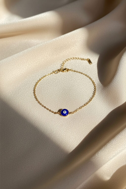 The focal point is a single, classic blue and white Evil Eye bead, set perfectly along the chain.