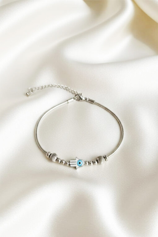 Adorn your wrist with this charming and durable Anti-Tarnish bracelet. Featuring a fine, polished silver band and delicate bead accents, this piece is designed for lasting shine through daily wear. The focal point is the miniature Hamsa Hand charm, an ancient symbol of protection, strength, and blessings, which beautifully holds a small Evil Eye motif at its center. The simple, elegant design and smooth finish make it perfect for subtle, everyday wear. With a secure closure and a minimalist silhouette, this lightweight bracelet is an essential accessory. It is an ideal gift for those who cherish spiritual jewelry and prefer a classic, understated look.