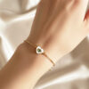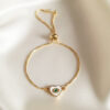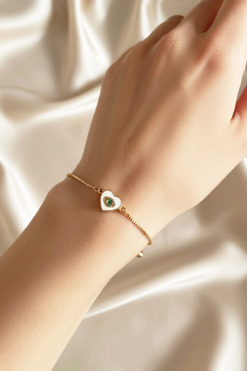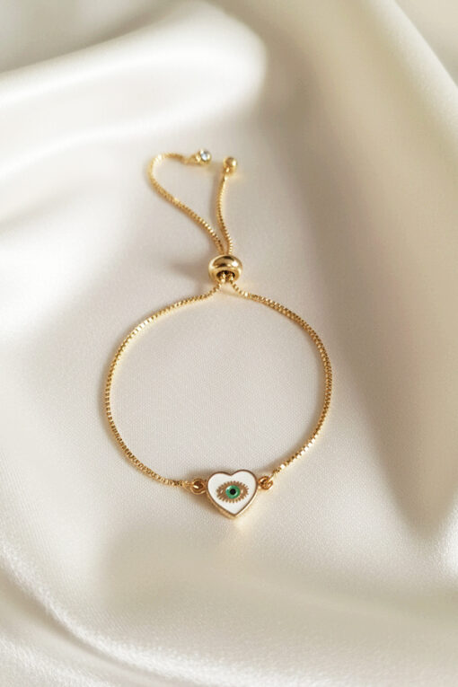 Adorn your wrist with this charming and effortlessly adjustable gold bracelet. The piece features a fine, sleek chain and a secure slider mechanism that allows you to achieve the perfect fit for any wrist size, finished with a subtle crystal accent. At its center is a unique green Evil Eye motif—symbolizing success, happiness, and good health—giving the romantic design a powerful talismanic quality. The combination of the heart (representing love) and the Evil Eye (symbolizing protection and good fortune) makes this piece deeply meaningful. Its elegant simplicity is perfect for subtle, everyday wear. This durable bracelet is an ideal accessory for a sophisticated, unique look or as a thoughtful, feminine gift.