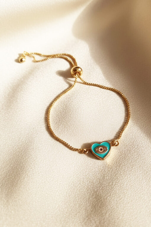 Adorn your wrist with this exquisite and perfectly adjustable gold bracelet. The piece features a fine, elegant chain and a secure slider mechanism (or bolo clasp), allowing you to easily adjust the bracelet for a comfortable, custom fit for almost any wrist size. The heart symbolizes love, while the Evil Eye is renowned globally for providing powerful protection and attracting good fortune. This beautiful blend of romance and spiritual meaning makes it a deeply personal accessory. Its delicate chain and high-polish gold finish ensure a sophisticated, clean look. Ideal for subtle, everyday elegance or layering beautifully, this durable accessory is an essential, worry-free piece for those who appreciate meaningful symbolism and the perfect personalized fit.
