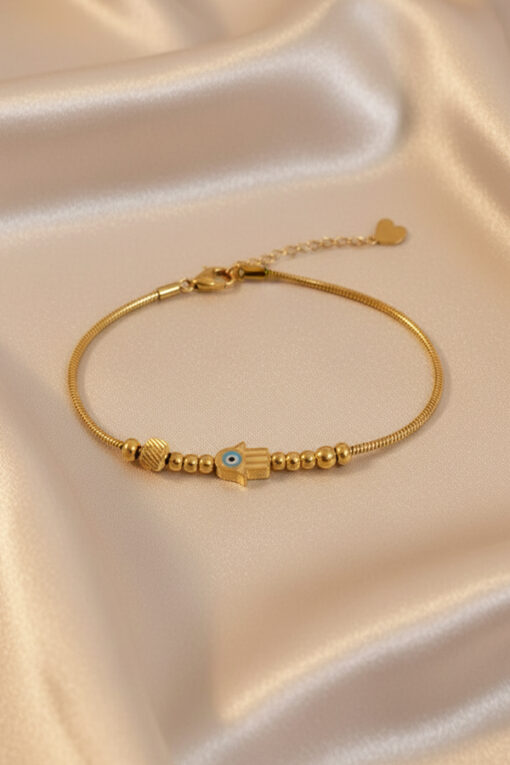 Adorn your wrist with this exquisite gold chain bracelet, combining elegance with powerful protection. Featuring an advanced anti-tarnish finish, this piece is designed for enduring, worry-free wear, maintaining its brilliant golden luster. The delicate chain is beautifully accented with fine gold beads and centered around two traditional charms: the Hamsa Hand (symbolizing blessing, strength, and good fortune) and a miniature Evil Eye motif with a vibrant blue iris (a classic talisman against negative energy). Its adjustable design and lightweight feel ensure a comfortable fit for everyday wear. Ideal for stacking with other delicate pieces or wearing alone, this durable and meaningful accessory makes a thoughtful, stylish gift.