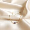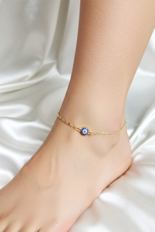 Adorn your ankle with this timeless and elegant gold anklet. The focal point is a single, petite Evil Eye charm, which is beautifully detailed with a vibrant blue enamel iris and encircled by shimmering micro-pave crystals. This tiny talisman is widely recognized as a powerful symbol of protection and good fortune. Its minimalist design ensures it pairs effortlessly with any summer sandals or casual footwear. This lightweight and durable anklet is an essential accessory for those who appreciate understated luxury and wish to carry a touch of protective meaning and subtle sparkle with them throughout the day, making it a perfect gift.