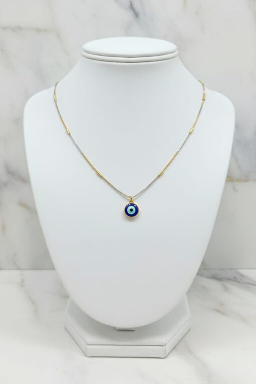 This piece features a beautifully contrasting two-tone chain, blending polished silver with subtle gold bar accents for a modern, unique appeal. The central charm is a classic, round Evil Eye pendant with a deep blue enamel iris and a bright white surround. This timeless motif is widely recognized as a powerful symbol of protection and good fortune. Its dainty size makes it perfect for subtle, everyday elegance, whether worn alone or layered gracefully with other chains. This lightweight, meaningful necklace is an essential addition to any jewelry collection and makes a thoughtful gift to wish luck and safety.