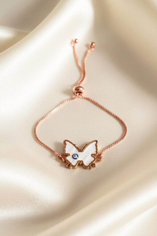 Celebrate beauty and transformation with this exquisite and perfectly adjustable bracelet. Crafted in a warm, polished rose gold tone, the piece features a fine chain and a secure slider mechanism (or bolo clasp), allowing you to easily achieve a comfortable, custom fit for any wrist size. Subtly placed on one wing is a miniature Evil Eye motif, a classic talisman renowned globally for providing protection and attracting good fortune. This bracelet beautifully blends feminine charm with powerful symbolism. Ideal for subtle, everyday elegance or layering beautifully, this durable, adjustable accessory makes a thoughtful, expressive gift.