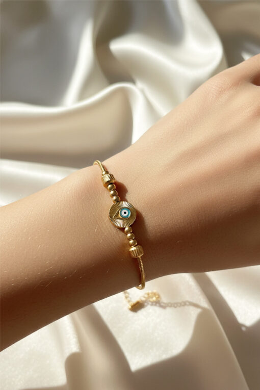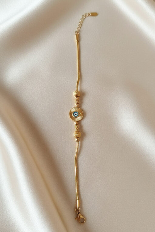 Define elegance with this sophisticated and durable gold bracelet. Featuring an advanced anti-tarnish finish, this piece is designed to maintain its brilliant shine for worry-free daily wear. The bracelet showcases a trendy Snake Chain design for a smooth, high-end drape on the wrist. The centerpiece is a beautifully detailed Evil Eye medallion, featuring a sunburst texture and centered with a classic blue iris. The charm is flanked by intricate beaded gold slider accents, which allow you to adjust the bracelet for a perfect, secure fit. This piece beautifully merges minimalist luxury with powerful symbolism, as the Evil Eye is a time-honored talisman for protection and good fortune.