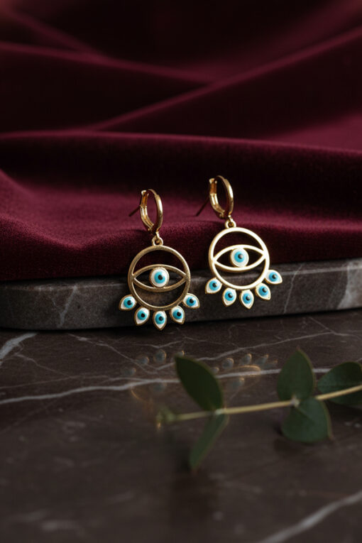 These Elegant Gold Evil Eye Drop Earrings combine timeless beauty with spiritual protection. The intricate design and luxurious finish make them perfect for both daily wear and special occasions. Lightweight yet durable, they offer comfort without compromising on style. Presented in a premium wooden box, these earrings make an ideal gift for yourself or a loved one. Elevate any outfit with this statement piece that blends elegance, meaning, and modern charm effortlessly.