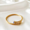 Elevate your jewelry collection with this sophisticated Gold Twisted Cable Cuff Bangle, a piece that perfectly balances industrial-chic aesthetics with timeless spiritual symbolism. The bracelet is defined by its signature twisted wire design, crafted in a radiant gold tone that catches the light from every angle, adding exceptional texture and dimension to your wrist stack. Unlike traditional charm bracelets, this piece offers a subtle, modern interpretation of the protective talisman. The open-cuff, bypass design features distinct end caps: one sleek, polished cone and one cylindrical setting holding a vibrant deep blue Evil Eye accent. This discreet pop of color not only adds visual interest but also serves as a personal guardian, believed to ward off negative energy and invite good fortune and clarity. Designed for versatility and comfort, the flexible cuff structure allows for easy wear and a secure fit on various wrist sizes. Whether worn as a daily signature piece or a special accessory for a night out, this durable and stylish bangle is a testament to modern elegance and meaningful design.