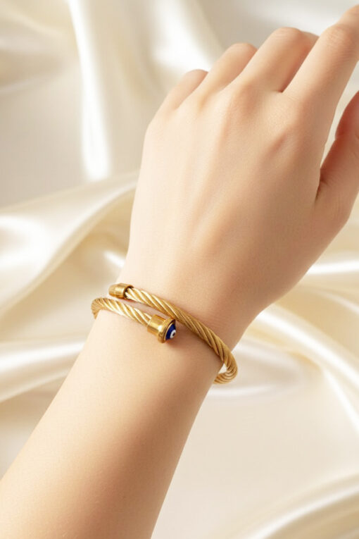 Elegant Gold Twisted Cable Cuff Bangle with Blue Evil Eye Accent