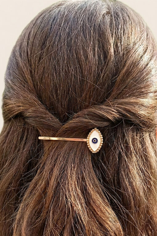 Elevate your hairstyle with a touch of sophistication and spiritual protection using this chic Evil Eye hair pin. The charm is designed with a vintage-inspired, beaded gold border that frames a smooth white enamel background and a striking blue iris. This classic Evil Eye motif is a timeless talisman, worn to ward off negative energy and attract good fortune. Whether used to secure bangs, accent a messy bun, or add a decorative touch to loose waves, this hair pin blends functionality with meaningful style. It is the perfect accessory for those who want to carry luck with them from head to toe.