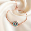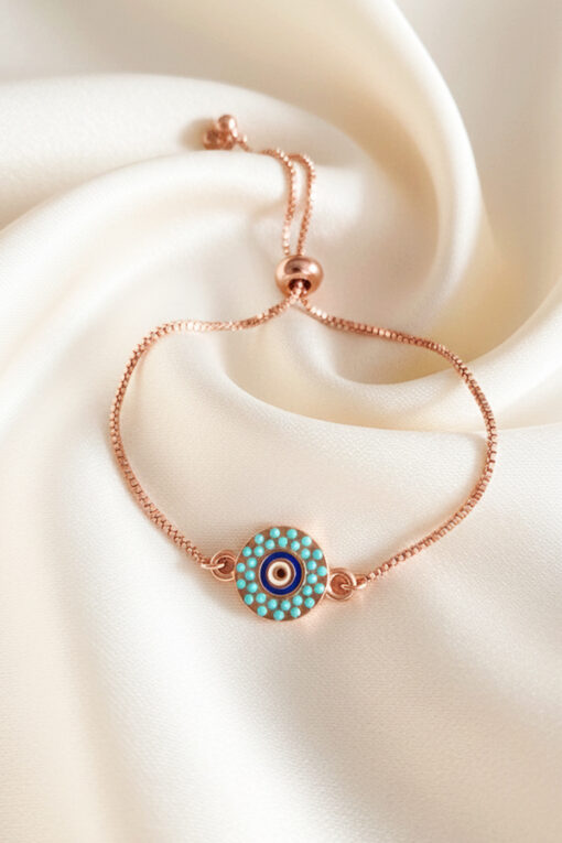 Adorn your wrist with this exquisite and perfectly adjustable bracelet. Crafted in a warm, polished rose gold tone, the piece features a fine chain and a secure slider mechanism (or bolo clasp), allowing you to easily achieve a comfortable, custom fit for any wrist size. It features a central blue iris surrounded by rings of tiny teal and gold dots, creating an intricate, dazzling effect. This classic motif is renowned globally for providing powerful protection and attracting good fortune. Its detailed aesthetic and high-polish finish make it an ideal accessory for subtle, everyday elegance or layering beautifully. This durable, adjustable piece is an essential, worry-free item for those who appreciate meaningful symbolism and the perfect personalized fit.