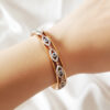 Wrap your wrist in a shield of shimmering luxury with this exquisite Rose Gold Evil Eye Bangle. This sophisticated piece reimagines the traditional protective talisman into a high-fashion statement. The bracelet features a sturdy, polished band with a striking open-work cutout design that feels both substantial and airy. Centered within the frame is a continuous row of elegant, marquise-shaped eye motifs. Each eye is outlined in brilliant white micro-pave crystals, creating a halo of light that draws attention to the vivid blue crystal center. This dazzling repetition creates an “eternity” style effect, ensuring that protective energy surrounds you from every angle. Whether you are dressing up for a special event or adding a touch of sparkle to office wear, this bangle is the perfect choice. Beyond its beauty, it serves as a powerful amulet to ward off negative vibes and attract good fortune. Gift this timeless piece to a loved one or treat yourself to a stunning blend of spiritual security and modern glamour.