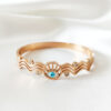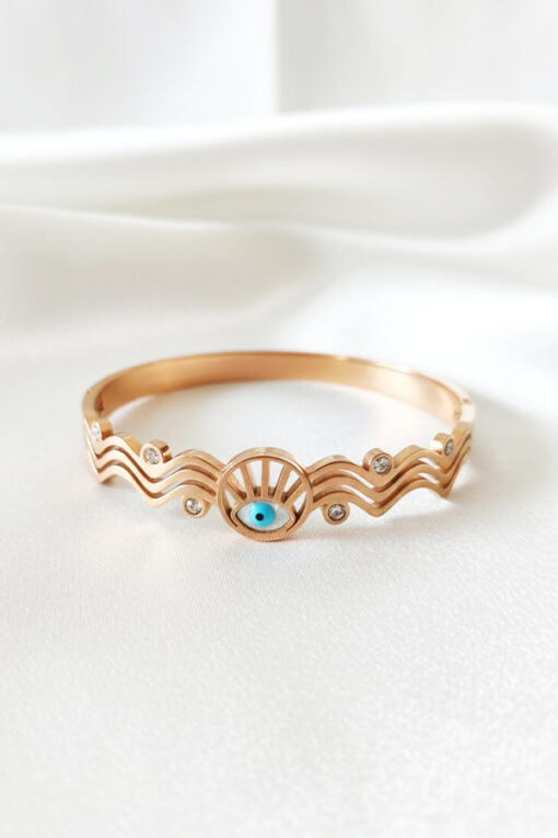 Immerse yourself in the fluid elegance and powerful protection of this exquisite rose gold bangle. The design stands out with its unique undulating wave pattern, featuring a double-band cut-out structure that mimics the gentle flow of water. This artistic silhouette creates a sense of movement and grace on the wrist. The centerpiece is a captivating Evil Eye motif, beautifully framed by a stylized sunburst or lash design in polished metal. The eye features a crisp white and vibrant blue enamel finish, serving as a timeless talisman to ward off negative energy and attract good fortune. The bangle’s hinged design ensures a secure and comfortable fit, making it easy to wear from day to night. This accessory is perfect for those who seek jewelry that balances organic, modern shapes with deep spiritual meaning. Whether worn as a standalone statement or stacked for a bohemian-luxe look, this bracelet is a stunning guardian of style.