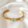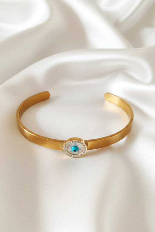 Elevate your daily style with this exquisitely designed gold cuff bangle, a piece that perfectly balances modern minimalism with timeless protective symbolism. The bracelet is defined by its sleek, flat band featuring a sophisticated satin or matte gold finish, offering a contemporary and understated alternative to traditional high-polish jewelry. This centerpiece features a lustrous, pearlescent white background—reminiscent of mother-of-pearl—centered with a striking turquoise iris. The charm is encircled by a halo of sparkling micro-pave crystals, adding just the right amount of glamour and light-catching brilliance to the matte band. Beyond its beauty, this bangle serves as a powerful talisman, traditionally worn to ward off negative energy and attract good fortune. The open-cuff design allows for a comfortable, adjustable fit on most wrists. Whether worn as a solo statement of elegance or stacked with other gold favorites for a curated look, this durable and stylish bangle is a versatile addition to any jewelry collection and a thoughtful gift of protection for a loved one.