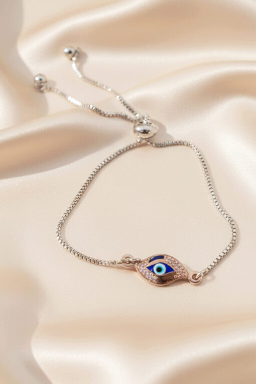 Adorn your wrist with this exquisite and perfectly adjustable silver bracelet. The piece features a fine, sleek box chain and a secure slider mechanism (or bolo clasp), allowing you to easily achieve a comfortable, custom fit for any wrist size. The outline of the charm is meticulously decorated with shimmering micro-pave crystals, while the iris is set in a vibrant blue enamel. This timeless motif is renowned globally for providing powerful protection and attracting good fortune. Its dazzling aesthetic and adjustable design make it an ideal accessory for subtle, everyday glamour or layering beautifully. This durable, elegant piece is an essential item for those who appreciate meaningful symbolism and the perfect personalized fit.