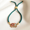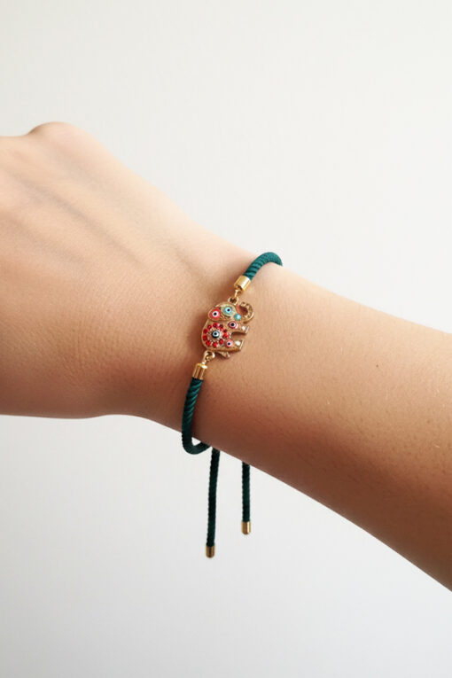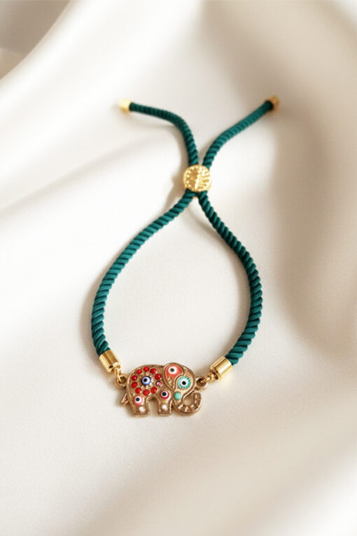 Emerald Green Adjustable Cord Bracelet with Enamel Elephant & Evil Eye