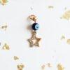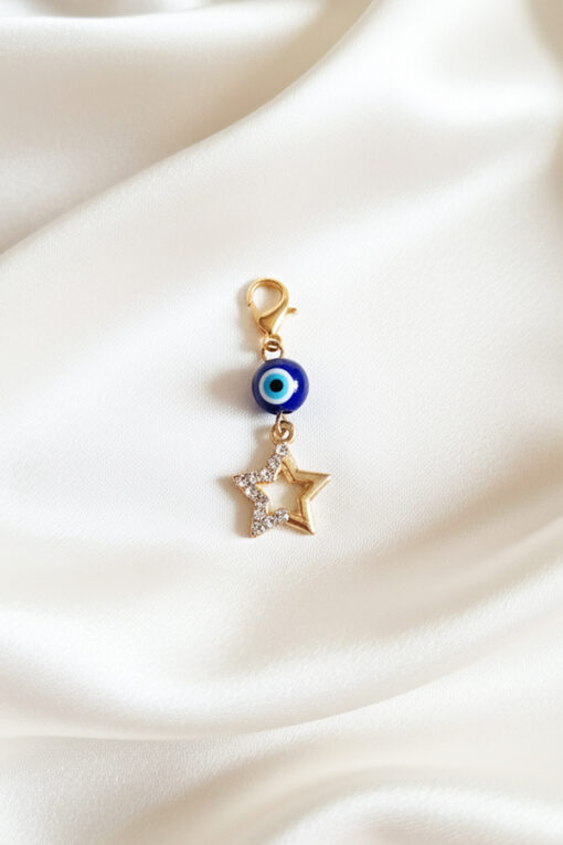 Carry good fortune and celestial style with this exquisite, meaningful charm clip. The design features a lower charm shaped like a five-pointed star, a beautiful symbol of guidance and luck. Part of the star is crafted with a brilliant pave crystal inlay, adding dazzling sparkle to the gold-toned outline. The charm hangs beneath a classic deep blue glass Evil Eye bead, which is a powerful and traditional talisman renowned globally for bringing good luck and safeguarding against negative energy. The durable gold-toned lobster clasp allows you to easily attach this piece to bracelets, necklaces, zippers, keychains, or planner rings. This stunning, versatile accessory makes a deeply thoughtful gift, symbolizing protection, hope, and elegant sparkle.
