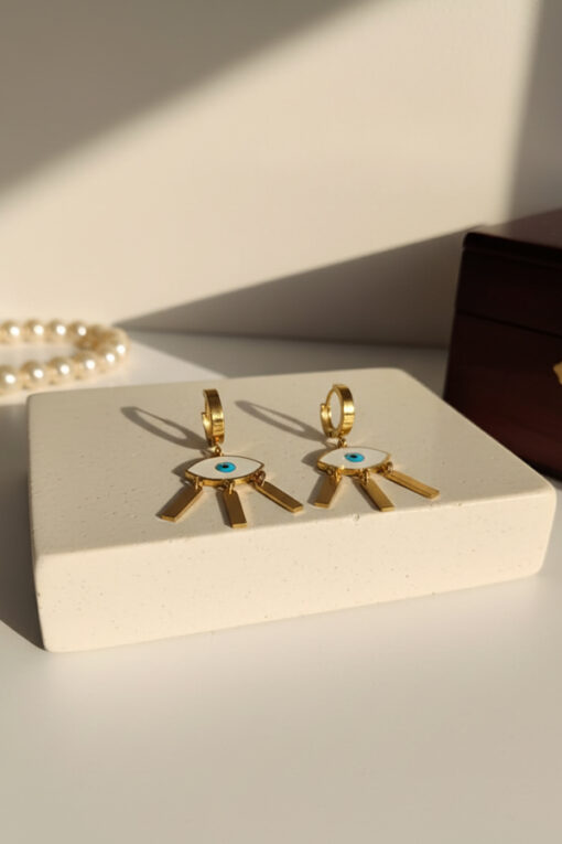 Featuring a mesmerizing blue and white evil eye charm symbolizing positivity and warding off negativity, these earrings are adorned with gold dangling bars that add graceful movement and sophistication.