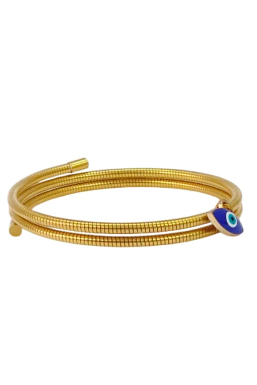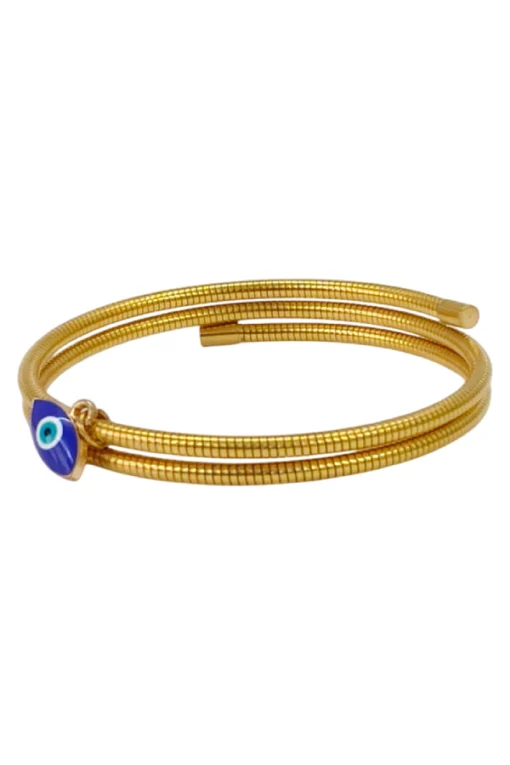 Crafted from premium SS 316 metal and coated with high-quality gold plating, this bangle exudes luxury while maintaining a lightweight, comfortable fit. The charm features a signature blue enamel Evil Eye charm, symbolizing good luck, positivity, and spiritual shielding. Its flexible, coil-style structure ensures easy wear and a snug fit on any wrist size, making it both elegant and functional.