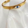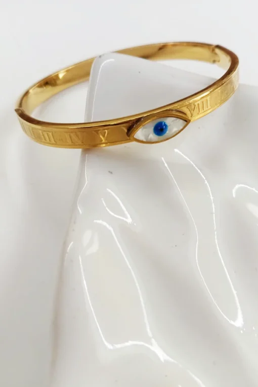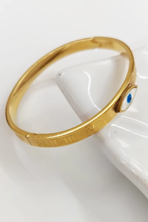 Timeless elegance meets spiritual charm in this exquisite Gold Roman Numeral Evil Eye Bangle. Beautifully crafted in premium metal with a luxurious gold finish, this bangle features engraved Roman numerals along its sleek band, symbolizing the eternal passage of time.